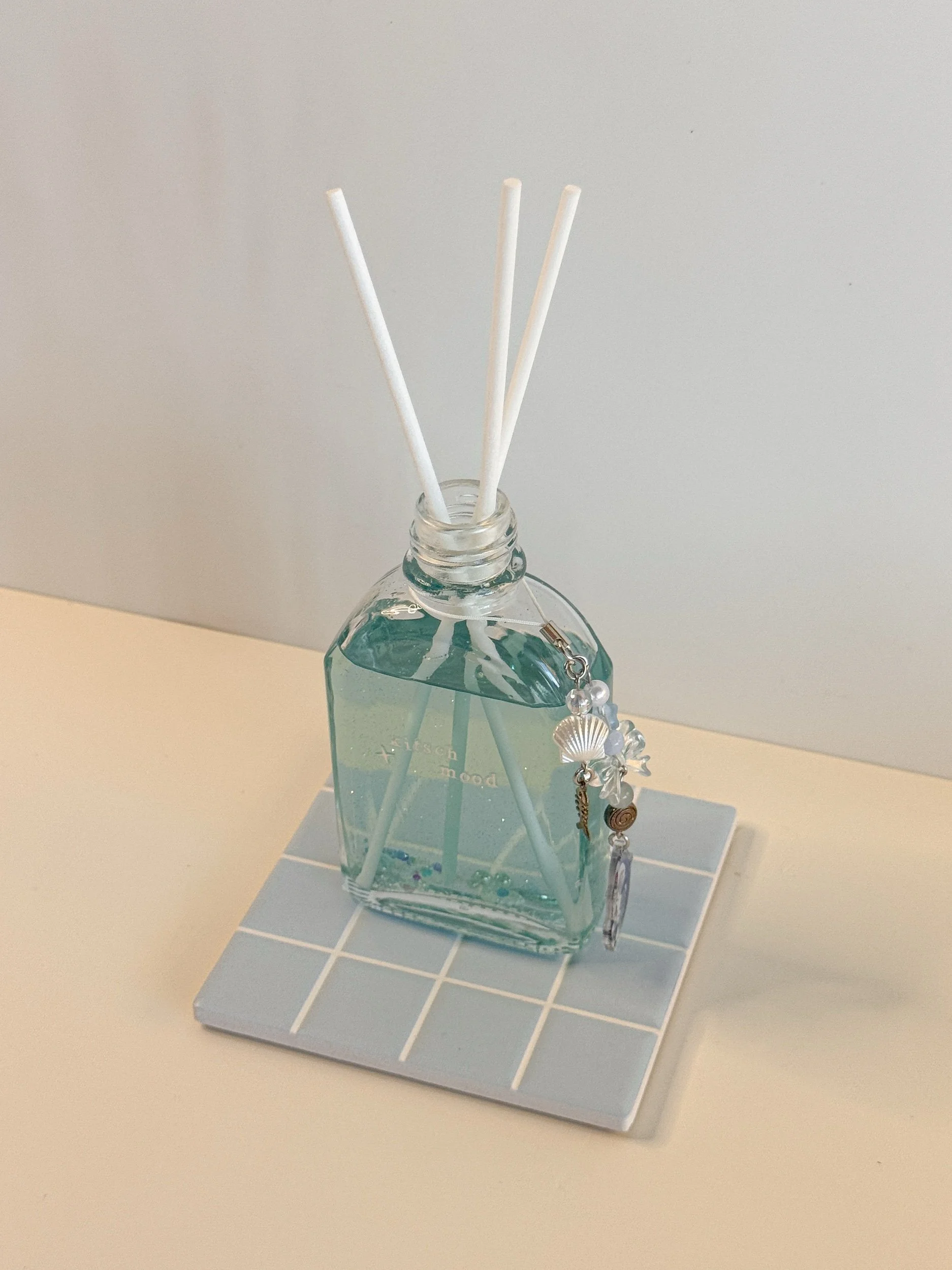 a hand-mixed, hand-poured reed diffuser in the form of a beautiful, minimal glass bottle. great for those of you that are uncomfortable with flames or electricity. decorated with glitter.